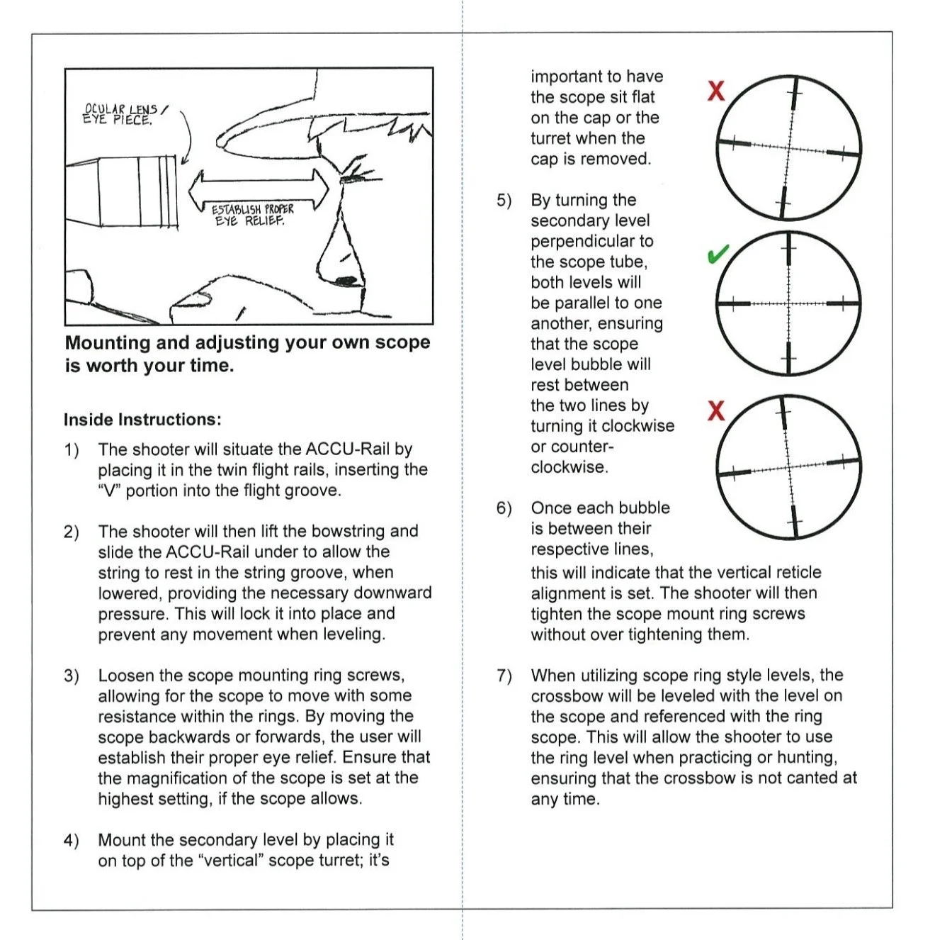 The Accu-Rail further aids the shooter to remove any variables, helping to eliminate any human error when aligning the scope to the crossbow, to help establish their proper eye relief. As a result, the distance between the shooter’s eye and the scope’s eye piece will always be correct, GUARANTEED!